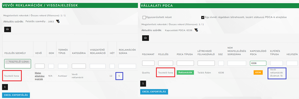 Amennyiben a Vevői reklamációk/visszajelzések felületről hozunk létre PDCA-t, a rendszer mostantól automatikusan átemeli a rögzített reklamáció számát és a felelőst a létrejövő PDCA-ba.